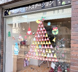 折り紙サンタは童画館通りに面したウインドウに、クリスマスツリーの形になるように1つ1つ貼っていきます。みんなで協力して少しずつ大きなサンタのツリーを育てていきました。そしてクリスマスには窓いっぱいに大きなツリーが完成しました。子どもたちの手作りツリーは温かみがあるなんともいい雰囲気で、思わず記念撮影してしまいました。