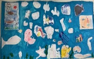 早速はじめてみると私が思っていたよりも詳しい子が多く、いろいろな魚をどんどん描いていくのでびっくりしました。また、生き物の図鑑を見ながら「こんな生き物がいるんだ!」と感心している子もいました。実在の生き物だけではなく、お気に入りのゲームに出てくる魚や子どもたちがこんな生物いたら面白いな、など想像力を膨らませて描いたものもできあがってきました。子どもたちの真剣に描く姿やいきいきしている姿があり、「みんなでこんな素敵なものが作れるんだ」と思いました。